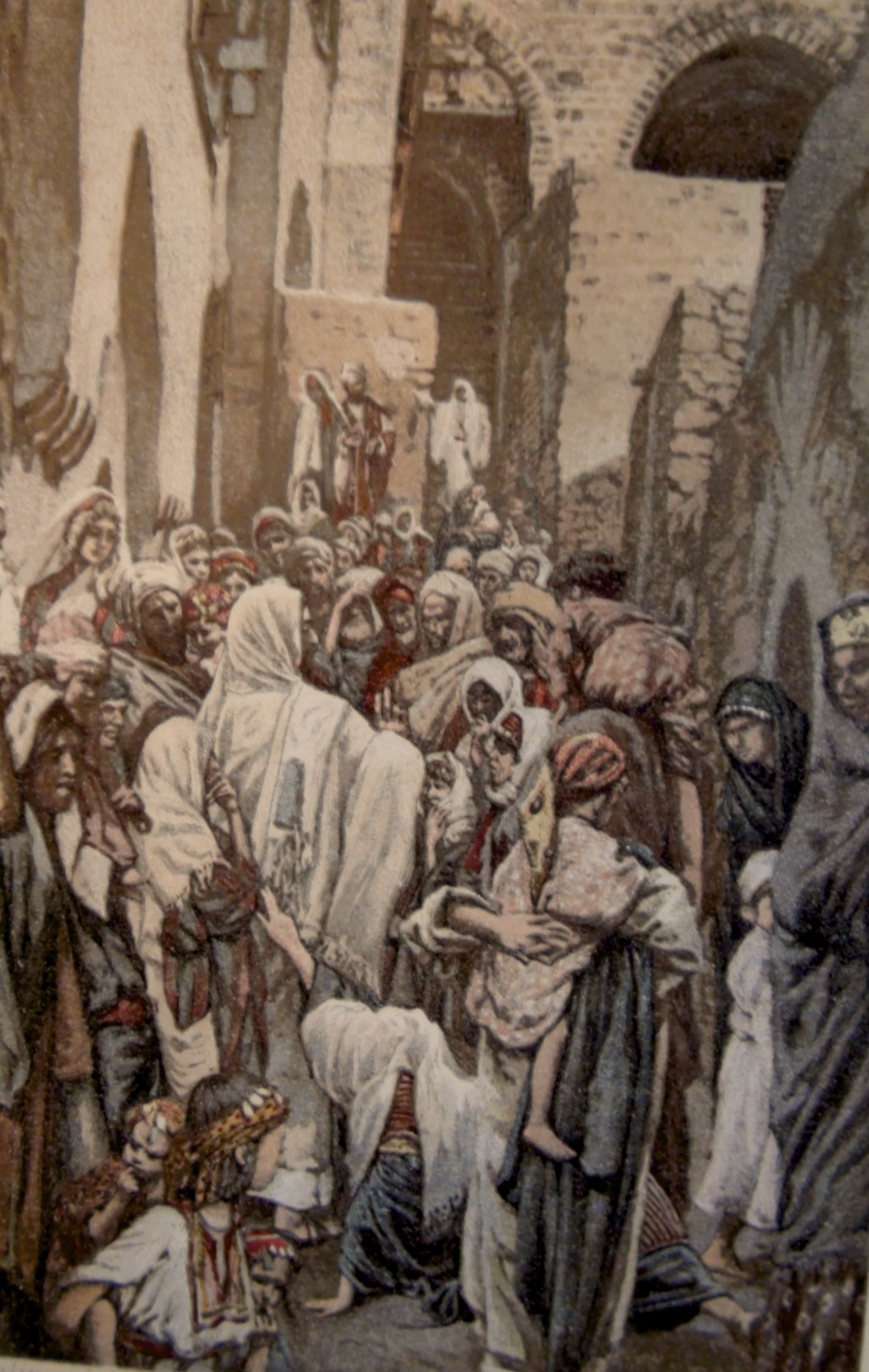 Het valt op hoe druk het is in de stad bij het meer, die op het werk van James Tissot de allure kreeg van de stad Jeruzalem. Jezus is moeilijk te zien. En de zieke vrouw verdwijnt helemaal in de menigte. Zo maakt de kunstenaar de gedachte van de vrouw duidelijk: Jezus zal het in de drukte niet door hebben dat ik even zijn kleren aanraak.